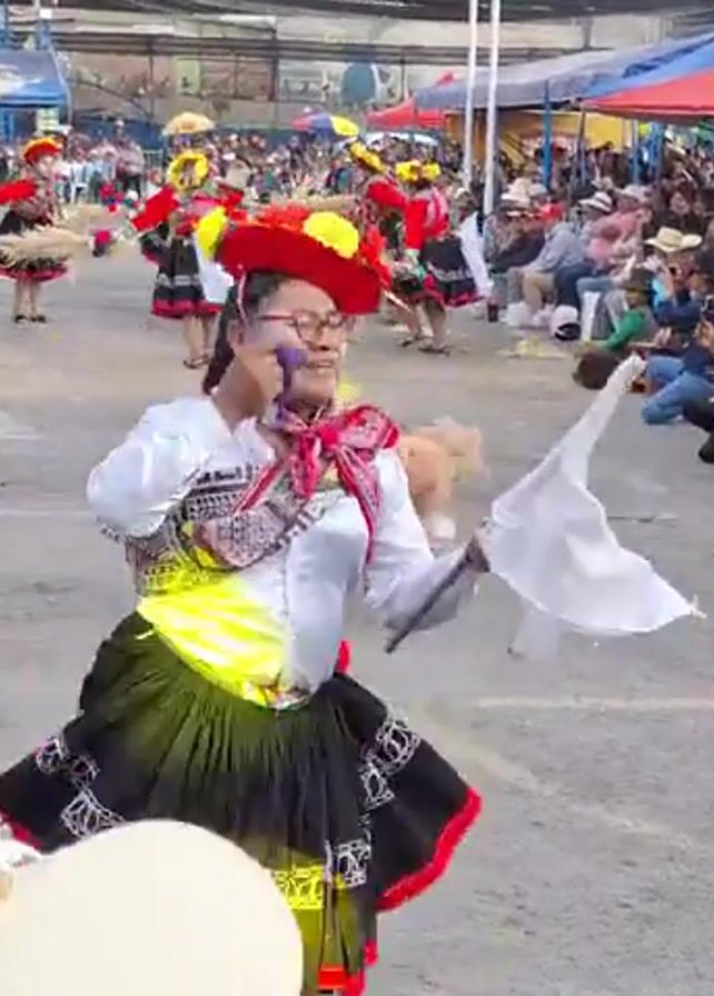woman dancing in a public space. She is wearing a traditional outfit including a red hat with yellow flowers, a white shirt, a colorful striped shawl, and a black skirt with white and red accents. She has long dark braids with colorful pom-poms. She is holding a white cloth and twirling as she dances. The space is a parking lot with several tents in the background and a crowd of people sitting and watching the performance. Other dancers in similar outfits can be seen in the background.