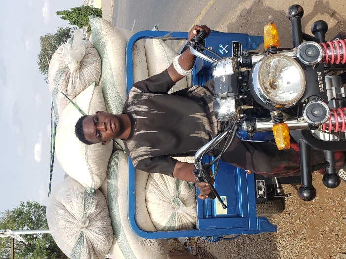 A young adult male, dressed in a black short-sleeved shirt with light grey stains and dark trousers, is seated on a blue three-wheeled cargo motorcycle