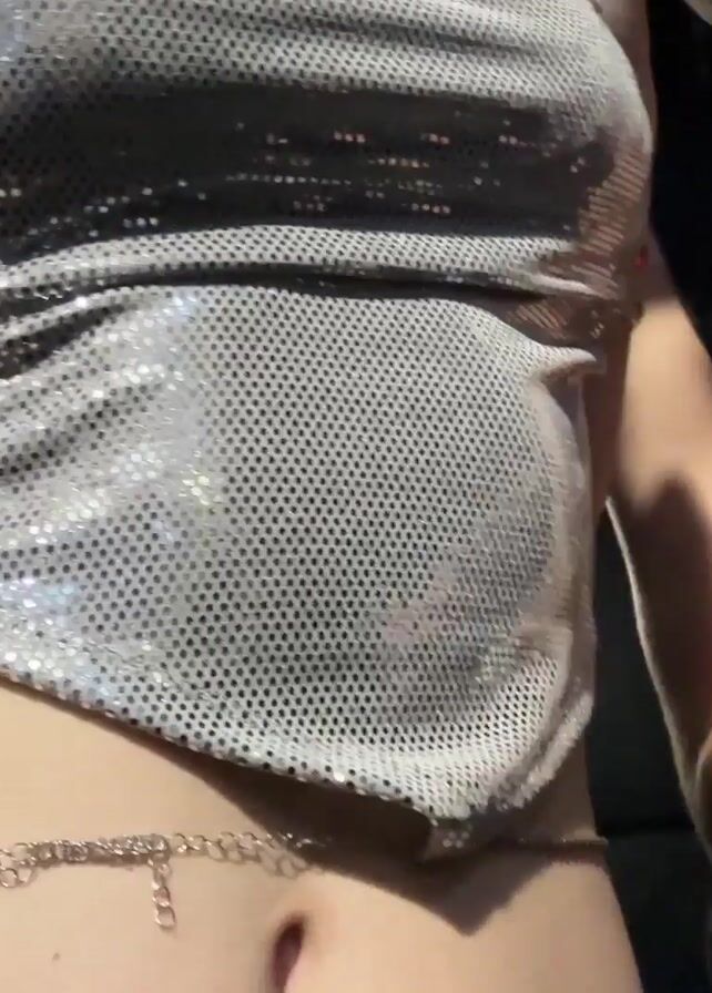 A young woman in a glittering silver crop top and a young man in a denim vest with his shirt open stand close together. The man puts his hand on the woman's waist and chest, and they both look at the camera. The woman has long, dark red nails and wears jewelry, including a snake-shaped ring and a body chain. The man wears sunglasses and also has jewelry. They appear to be at a concert or other event, and are enjoying themselves.