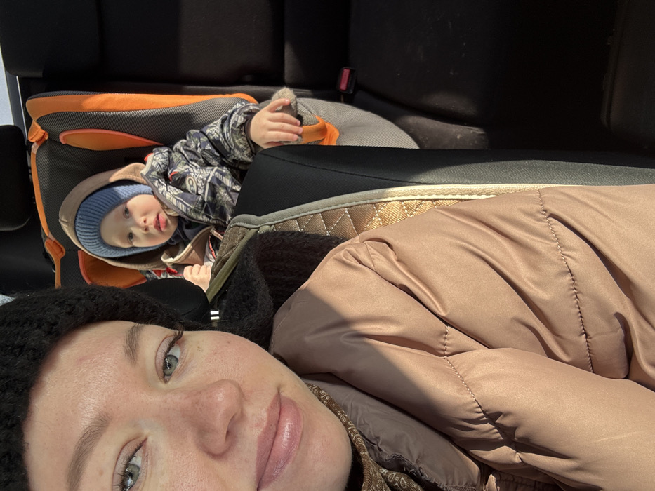 The image depicts a forward-facing photograph taken inside a vehicle in the city of Ферма, Russia. In the left foreground, a female subject is partially visible, facing the camera. She has light-colored eyes, freckles on her face, and is wearing a black knitted hat, a light brown quilted jacket, and a patterned scarf under the jacket. Her lips are light pink. Behind and to the right of the female, a young child, consistent with a toddler, is secured in an orange and gray child safety seat in the rear passenger area. The child is wearing a light blue knitted beanie, a brown hooded jacket over a patterned winter coat, and dark attire. Both individuals are looking directly at the camera. The child's right hand is visible resting on the car seat. The vehicle's interior features dark-colored rear seats, and a tan/brown patterned seat protector is visible on the back of the front passenger seat. Bright natural sunlight illuminates the scene from the right, casting highlights on the subjects and interior.