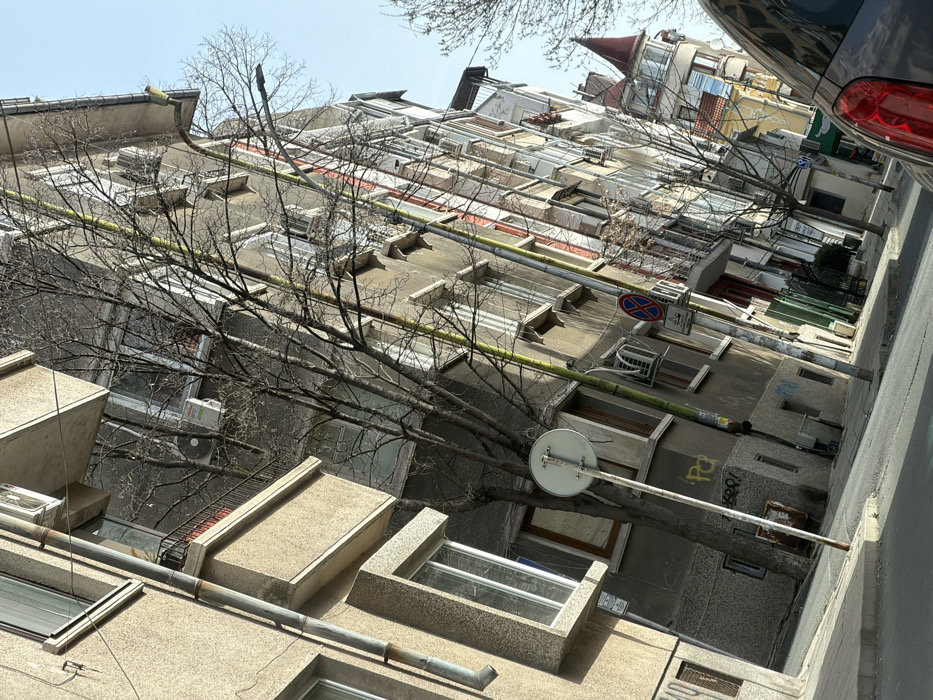 This image presents a tilted, street-level view of an urban environment in Burgas, Bulgaria, under clear daylight conditions. The scene is dominated by several multi-story buildings lining a paved street. On the immediate left, a light-colored, stucco-finished building with rectangular windows and projecting balconies is visible, featuring an external drainpipe. Adjacent to it, a darker, possibly grey-toned building displays numerous windows, some with ornate cornices, and multiple external air conditioning units. Vertical utility conduits, including bright yellow-green and red lines, run up its facade. Deciduous trees with bare branches are sparsely distributed along the sidewalk and street, indicative of winter or early spring. In the foreground, a white circular road sign, viewed from its rear, is mounted on a metal pole on the sidewalk. Further down the street, a blue circular road sign with a red diagonal line (indicating 'No Stopping' or 'No Parking') is visible on another pole. Graffiti is present on a lower section of a building wall near the foreground. In the background, beyond the immediate street scene, a distinctive building with a red conical roof is discernible. A portion of a dark-colored vehicle's rear bumper and a red taillight occupy the bottom right corner of the frame, suggesting the photograph was taken from within a car. No individuals or specific actions are depicted.