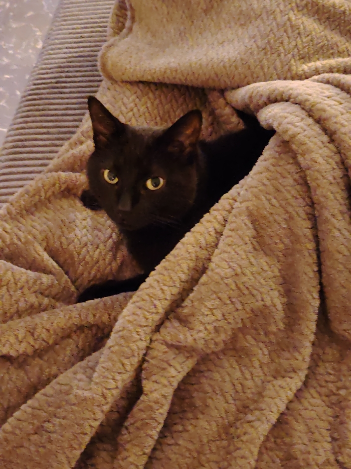 - "A black cat with piercing yellow eyes peers out from under a tan blanket" by FM-StHk23, licensed under CC BY 4.0