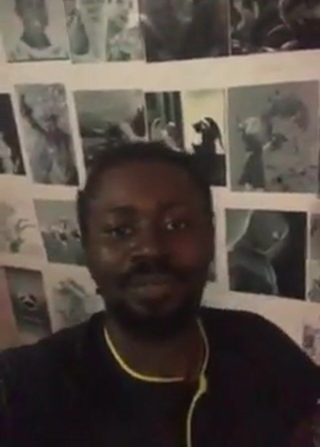 A medium shot captures a man with dark skin and a beard. He is wearing a black t-shirt with a yellow trim. He is looking directly at the camera with a slight smile. The background features a wall adorned with numerous black and white prints or photographs. The lighting is somewhat dim.