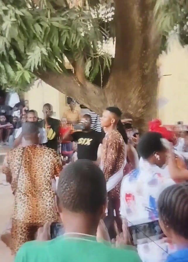 crowd of people gathered outdoors under a large tree, seemingly at a celebration or event. Many individuals are holding up their phones, possibly recording or taking pictures. Several people are wearing clothing with leopard-print patterns. One person is wearing a white sash. A man in a black shirt with the word "SIX" printed on it is also filming with a phone. In the background, some people are sitting on a low wall. The setting appears to be a warm, sunny day. There is music playing.