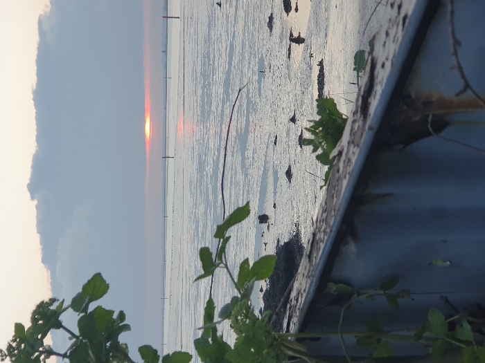 The image depicts a broad expanse of water at sunrise or sunset, located in Great Yarmouth, United Kingdom. The sky is partially overcast, with a reddish-orange sun visible as a horizontal strip on the distant horizon, its light reflecting on the water. A large grey cloud mass occupies the upper central portion of the sky. The mid-ground is a vast, reflective expanse of water, consistent with a tidal estuary or mudflats, populated by numerous small, dark objects (likely birds or debris) and several slender, vertical posts spaced intermittently. Darker patches of exposed mud or land are visible along the water's edge in the mid-ground. A faint silhouette of urban structures is discernible on the distant horizon. The immediate foreground presents a corroded, blue-gray corrugated metal barrier, exhibiting rust and peeling paint, extending horizontally across the lower portion of the frame. Out-of-focus green foliage partially enters the frame from the upper left. Additional green vegetation grows along and over the metal barrier in the lower foreground. No individuals or active subjects are discernible within the scene.
