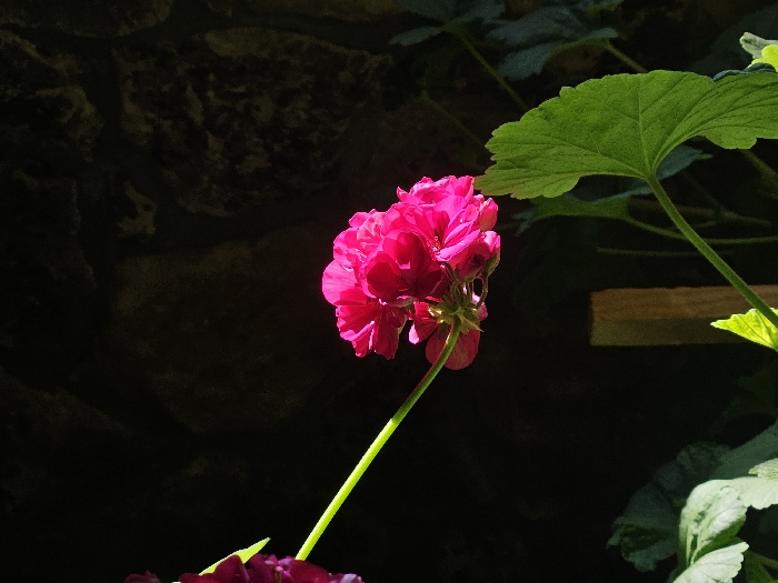 - "The scene, located in Melnik, Bulgaria, depicts a close-up of vibrant pink flowers and green foliage against a deeply shadowed stone wall" by FM-KxMq23, licensed under CC BY 4.0