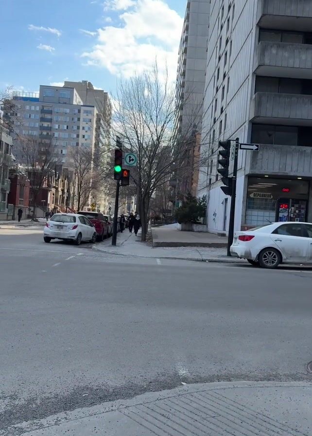 city street intersection on a sunny day. A traffic light is visible, changing from green to orange and then to red. Several parked cars line the left side of the street. A group of people are walking on the sidewalk towards the intersection. There's a building with a store labeled "Dépanneur" on the right. A white car is parked along the curb in front of the building. The sky is blue with some clouds. The intersection appears to be in a residential area with tall apartment buildings.