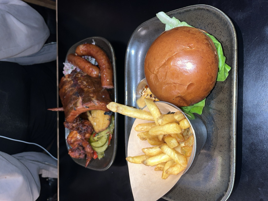 The image displays two meals served on dark, textured plates on a black table within a restaurant, likely a Big Easy Bar.B.Q & Lobstershack establishment in London, United Kingdom. In the foreground, a rectangular plate holds a hamburger with a glossy, brown bun and visible green lettuce, alongside a metal cup filled with golden-brown french fries contained within a brown paper liner. A small ramekin of dipping sauce is placed next to the hamburger. In the background, a second identical plate features a large barbecue platter: a rack of glazed ribs centrally positioned, several roasted chicken wings on the left, and two curved sausages on the right. Accompanying items include shredded white and red cabbage (coleslaw) and grilled vegetables, specifically slices of zucchini or cucumber and a possible potato wedge. A partially visible individual, wearing a light grey outer garment over a dark top, is seated at the table, their upper torso and arms framed in the background. The environment is dimly lit, indicative of an indoor dining setting.
