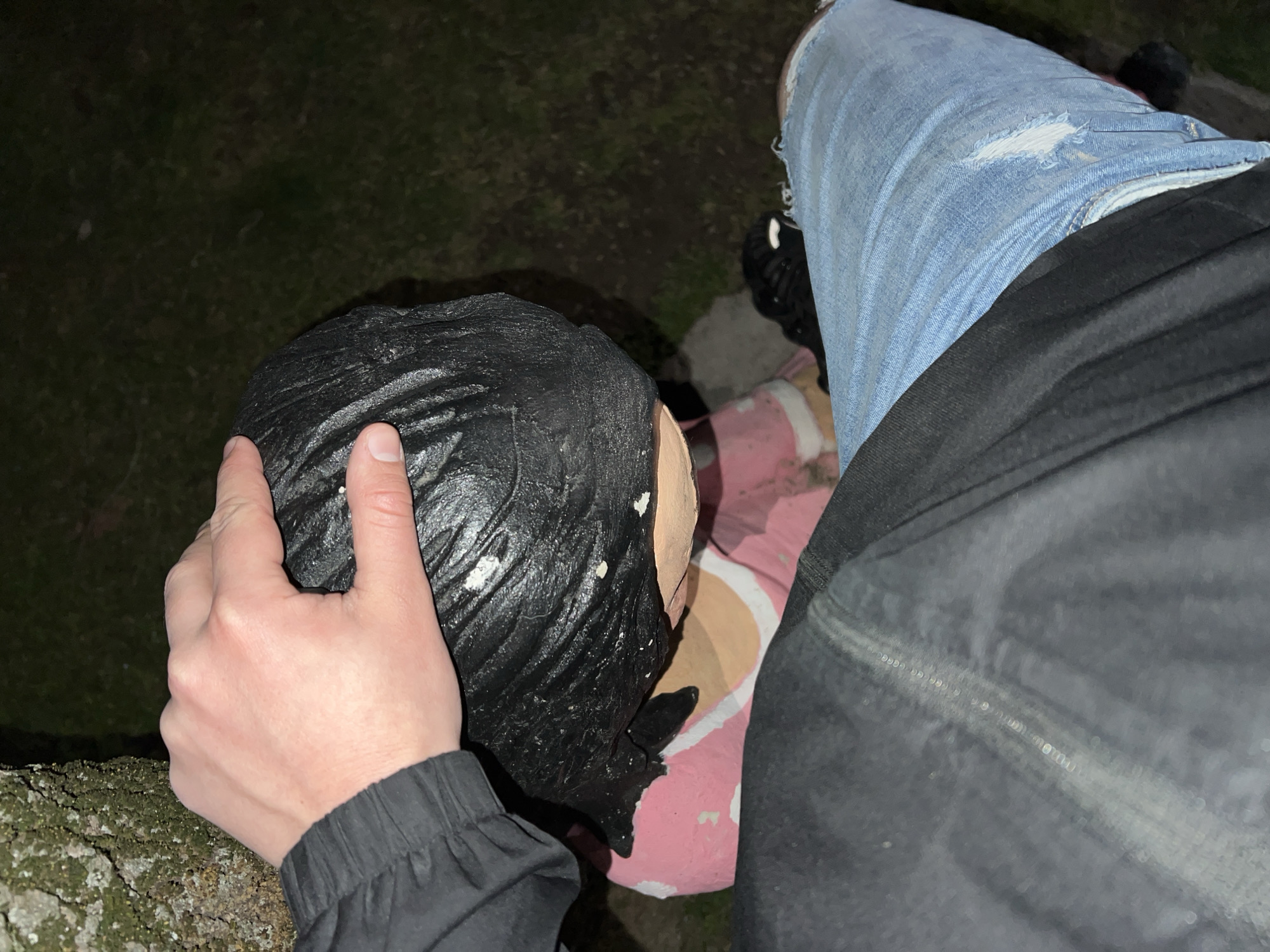 The image displays a close-up, high-angle perspective of a human hand resting on the head of a statue, set in Rakovski, Bulgaria. A fair-skinned human hand, extending from a black long-sleeved garment, is positioned on the upper portion of a statue's head. The statue's head is painted black with a textured surface, resembling stylized hair, and exhibits several white paint marks. A portion of the statue's face, painted in a light beige or flesh tone, is visible below the hand. The statue's upper body is dressed in a pink garment with lighter pink or white painted details, showing signs of paint wear. In the lower frame, a human leg, clad in light blue distressed jeans, is partially obscured by black fabric. To the far left, a section of a moss-covered tree trunk is visible. The environment appears dark and consists of out-of-focus ground vegetation, indicating low light conditions, likely nighttime.