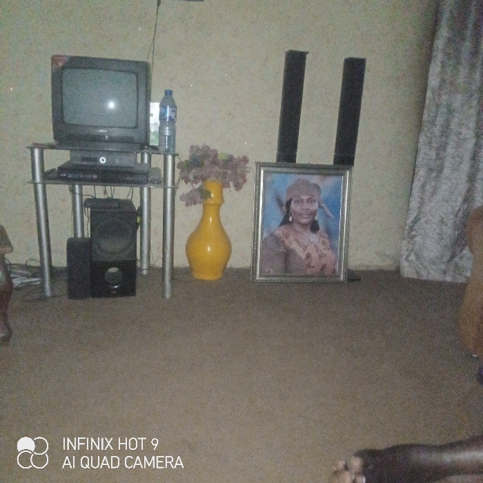 The image depicts an indoor scene with a CRT television on a metal stand. Next to it is a water bottle, a yellow vase with flowers, a framed portrait of a woman, and two tall black speakers. A smaller black speaker sits on the floor under the TV stand. Drapes are visible in the background. In the foreground, a person's legs and feet are partially visible. The room appears to be dimly lit with beige walls and flooring. A phone watermark is in the lower-left corner.