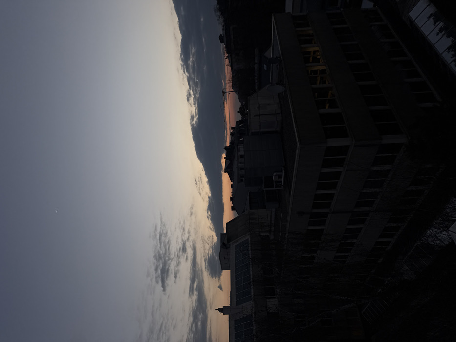 The image depicts an urban landscape in Luxembourg City, Luxembourg, at dusk. The sky, occupying the upper two-thirds, transitions from a pale blue-grey at the zenith to an orange-pink horizon, indicative of sunset. A faint, slender crescent moon is visible in the upper left quadrant. Scattered grey clouds are present across the mid-sky. In the foreground and midground, a dark, multi-story building dominates the scene. This structure features numerous rectangular windows, with one upper-floor window displaying internal illumination, casting a warm yellow light. The building has a flat roof equipped with various dark-colored HVAC units and other industrial installations. To the left, a portion of an adjacent building with solar panels on its sloped roof is visible. Dark, bare tree branches obscure parts of the lower left foreground. In the background, a dense cluster of other buildings with varied rooflines (gabled and flat) extends towards the horizon. Some roofs feature chimneys and antenna structures. Distant hills with discernible tree lines are present on the far right background. No individuals or specific interactions are visible within the frame. The overall environment suggests a dense urban or commercial district with a mix of modern and older architectural styles, set against a hilly topography typical of Luxembourg City. The precise street or neighborhood is not identifiable from the visual information alone.