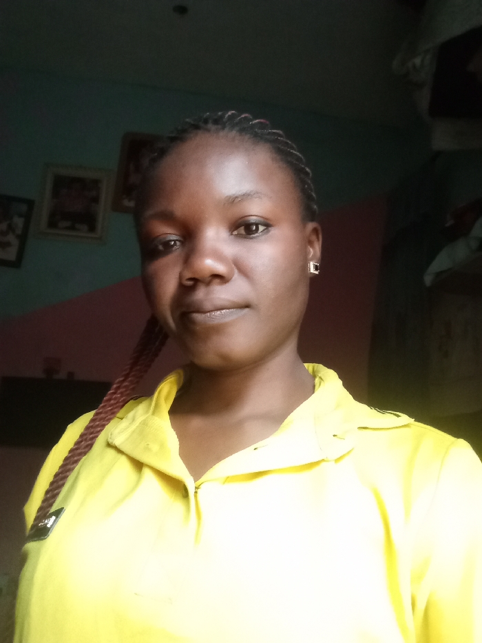 An indoor close-up photograph features an adult female with dark skin and dark braided hair, looking directly at the camera. She wears a bright yellow collared polo shirt with a visible zipper placket and a small dark rectangular emblem on the upper left chest. A square-shaped earring, dark with a lighter border, is present on her right ear. The background consists of a wall painted with a darker teal or blue-green upper section and a lighter pink or reddish-brown lower section. Three framed pictures or artworks are visible on the wall, with indistinct contents. A dark, obscured object is positioned on the lower left, and indistinct items are visible on the far right. The scene is located in Fagge D2, Nigeria.