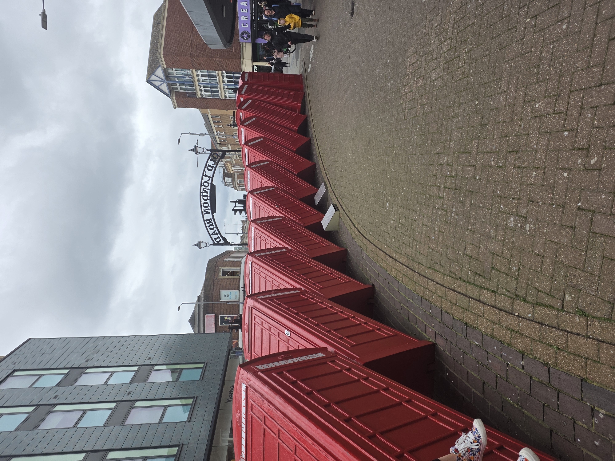 row of red telephone booths lined up along a brick-paved street. An archway with the words "Old London Road" spans the street. Several people can be seen in the background, including a group near a building. Buildings with various architectural styles are visible on both sides of the street, with a gray, modern building on one side and a brick building on the other. The sky is overcast. A pair of shoes are at the bottom of the image, perhaps the feet of the person taking the photo.