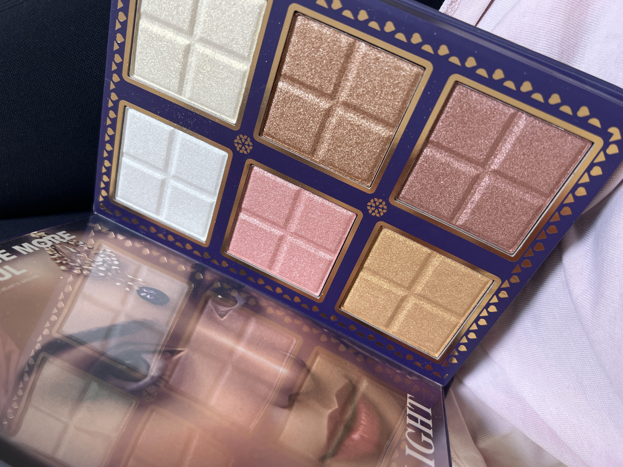 The image displays an open makeup palette, observed from a slightly elevated, oblique angle. The palette features a dark indigo or purple frame with a gold-colored decorative border patterned with small heart-shaped elements and geometric motifs. Inside, six square pans of shimmery pressed powder are arranged in a 2x3 grid. Each pan is embossed with a cross pattern. The powder colors include (from top-left): shimmery white, shimmery pale champagne, shimmery light pink, shimmery bronze, shimmery gold, and shimmery rose gold. The left side of the image shows the inside of the palette's lid, which features a promotional image of a woman's lower face, including her nose, lips, and eye, partially covered by a transparent plastic sheet. Text fragments "E MORE" and "LIGHT" are visible on the lid. A small decorative element resembling a speckled feather or leaf is also present on the lid's image. The palette rests on a soft, light-pink or pale lavender fabric, likely clothing, exhibiting a visible textile texture. A dark, indistinct area occupies the upper right background. The specific location within Kabile, Bulgaria, cannot be determined from the visual information provided in the image. No individuals are physically present in the scene.