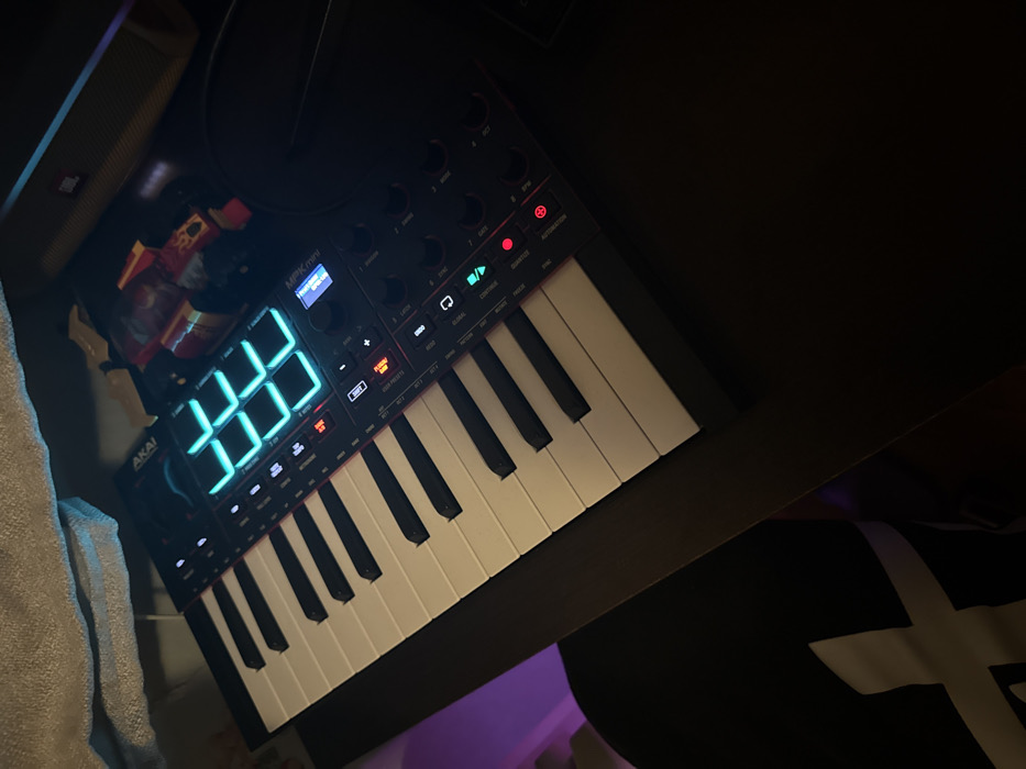 The scene depicts an indoor, dimly lit environment, likely a personal workspace or studio. The primary subject is an AKAI MPK Mini MIDI keyboard controller, powered on, positioned on a dark, flat surface, presumably a desk. The controller features a 25-key piano-style keyboard and a control panel with eight illuminated light-blue square pads, a small digital display showing "MPKmini," and various knobs and buttons, including indicator lights in red, green, and white. A red light is illuminated near a label that appears to read "RECORD," and a green arrow light is also active. To the upper right of the controller, a yellowish-brown cylindrical object, consistent with a portable speaker (e.g., JBL), rests on the dark surface. Below the speaker, a red and black toy car is partially visible. In the upper left background, a light-colored, possibly white or light blue, textured fabric is draped. In the lower left foreground, a partial view of a person wearing a dark garment with a distinctive white 'X' or cross-like emblem on the shoulder/upper arm area is visible. A purple ambient light source illuminates the area to the left of the person. No active interaction with the musical equipment is observed. The specific location within the city of Provadia, Bulgaria, cannot be determined from the visual evidence provided.