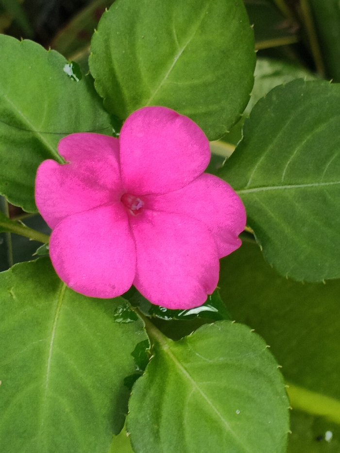 A vibrant pink flower with five petals sits prominently amidst several green leaves. The flower has a delicate texture, while the leaves have a waxy sheen and visible veins. Water droplets are visible on some of the leaves, adding a touch of freshness to the scene. The close-up shot highlights the flower's detail and color, and the surrounding foliage provides a lush, natural background.