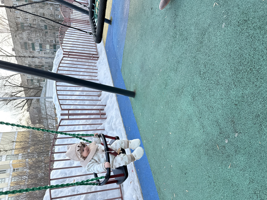 The image depicts an outdoor playground scene in Sadovaya, Russia. A young infant, dressed in a beige knitted hat, sweater, pants with heart patterns, and white booties, is seated in a red and black toddler swing with green rope chains. A small wooden cross-shaped charm is visible on the infant's attire. The swing is positioned over multi-colored rubberized playground surfacing, predominantly blue and green. Behind the swing set, a low, reddish-brown metal fence runs horizontally, separating the play area from a large accumulation of snow. In the background, leafless trees and several multi-story residential buildings with visible balconies are present under a pale sky. A partial view of an adult's foot wearing a brown shoe is visible on the green rubberized ground in the lower right corner of the frame. A second, black, circular-shaped swing is partially visible to the right of the primary swing set structure.