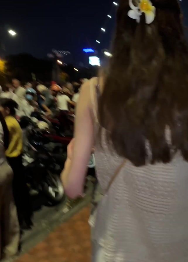 nighttime scene of a crowded public area. People are gathered, and there are many parked motorcycles. A woman with a white flower in her hair takes photos with her phone. Other people are also taking photos and interacting with each other. The environment is urban, with streetlights and lit-up signs in the background. The overall atmosphere appears lively and social.