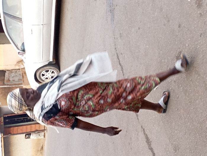 The image depicts an adult female walking on a paved road in an urban or suburban area within Jos, Nigeria