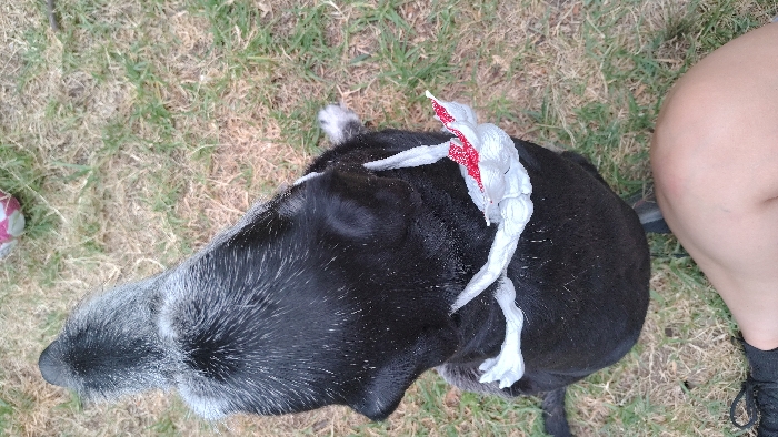 A black dog sits on a grassy lawn, its head toward the left. The dog has a white, aging muzzle. A crumpled, shiny white and red material rests on its back. A person's leg and shoe are visible on the right edge of the image. The dog's fur is speckled with white. The grass has patches of dry, brown areas mixed with green.