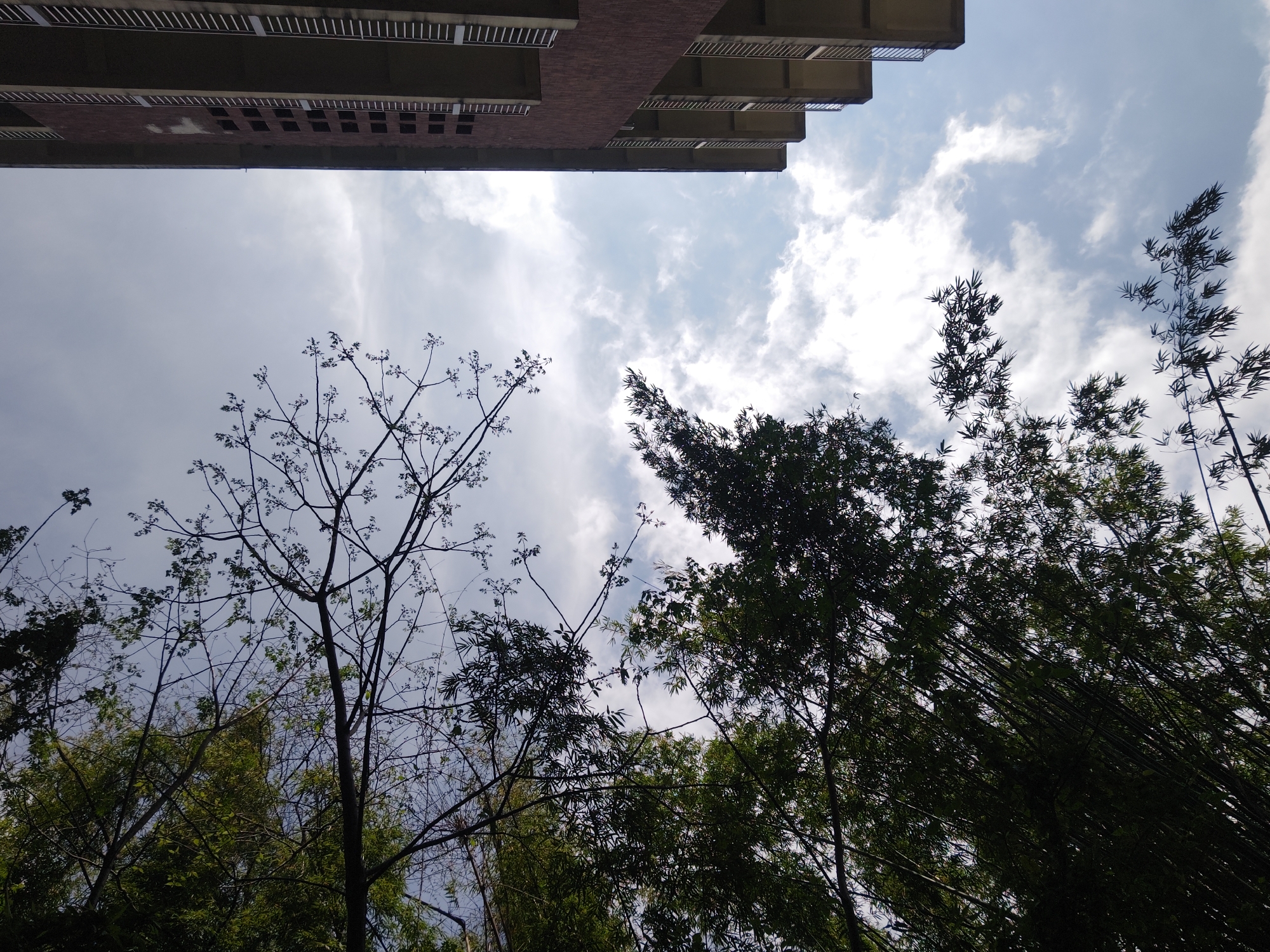 An upward-angle shot shows a building, trees, and the sky in Chongqing High-tech Zone, China. The building is partially visible at the top of the frame, revealing balconies and brickwork. Below the building, treetops frame the sky, with both bare branches and dense foliage. The sky is filled with a mix of white clouds and blue sky. The overall impression is a blend of urban and natural elements.