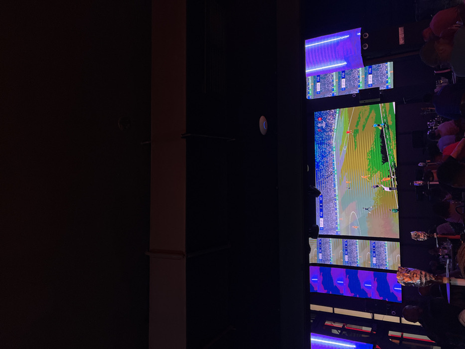 - "dimly lit indoor space, likely a bar or sports lounge, with a large screen displaying a soccer match" by FM-4Vw7i1, licensed under CC BY 4.0