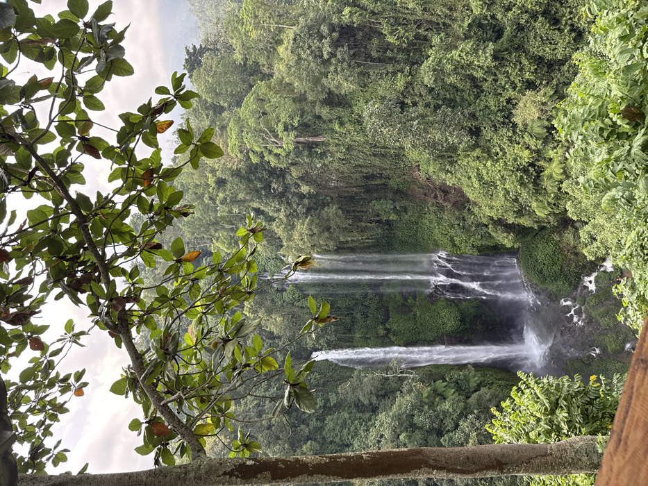 Lush green foliage frames a cascading waterfall in this nature photograph. The waterfall consists of multiple streams falling down a rocky cliff into a verdant valley. A tree branch with leaves is prominent on the left side, while dense forest covers the hills. The sky is overcast, casting a soft light on the scene. A wooden railing is visible at the bottom of the image.