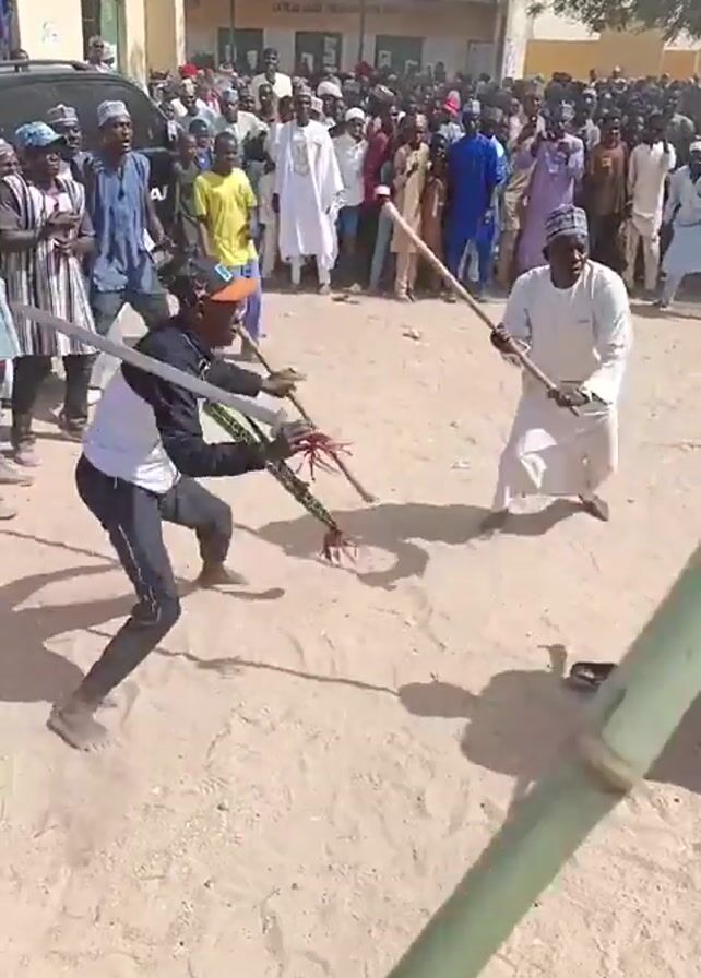 two men engaged in a stick-fighting contest in a sandy open area, surrounded by a large crowd of onlookers