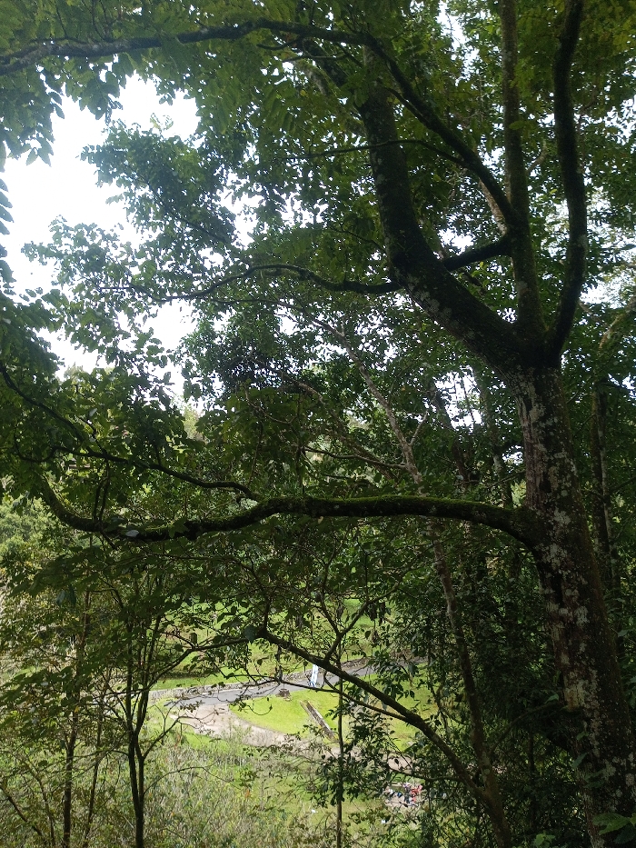 The image depicts an elevated view looking down into a forested valley or clearing in Cimacan, Indonesia. The immediate foreground and upper two-thirds of the frame are filled with the dense green canopy and multiple dark brown trunks of mature trees, their bark textured with light-colored lichen and moss. Tree branches extend across the mid-ground, framing the scene below. Sections of bright, overcast sky are visible through gaps in the foliage. In the lower third of the image, visible through the trees, an open area features a winding, light-grey paved path or road. This path traverses sections of vibrant green grass. To the left of the path, a prominent, tall, slender white structure, possibly a statue or architectural element, stands on the grass. Further along the path, in the lower-center, multiple indistinct small human figures are discernible, some clustered near a small red object, which may be a vehicle or piece of equipment. The cleared area is bordered by additional trees and undergrowth in the background.