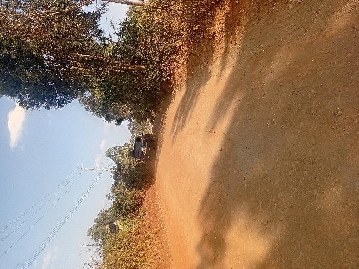 A dirt road curves through a forested area. Trees line the left side, while a vehicle is visible further along the road. Power lines extend along the left side of the road. The road surface is brown and dusty, showing signs of wear. Sunlight casts shadows across the road, highlighting the uneven terrain. The right side of the road has some vegetation.