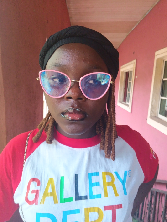 A dark-skinned individual is depicted from the chest up, facing forward with a neutral expression. The subject wears a black ribbed head covering and pink cat-eye sunglasses with reflective blue lenses. Their lips are glossy with a central iridescent application. Brown, textured braids are visible on the subject's right side. They are wearing a white t-shirt with red raglan sleeves, emblazoned with "GALLERY DEPT" in multi-colored block letters. A thin, silver-colored chain is draped over the left shoulder. The background comprises a reddish-brown wall to the left and an overhead structure of the same color. To the right, a bright pink wall features two white-framed rectangular windows with vertical mullions. The scene is located in Obosi, Nigeria.
