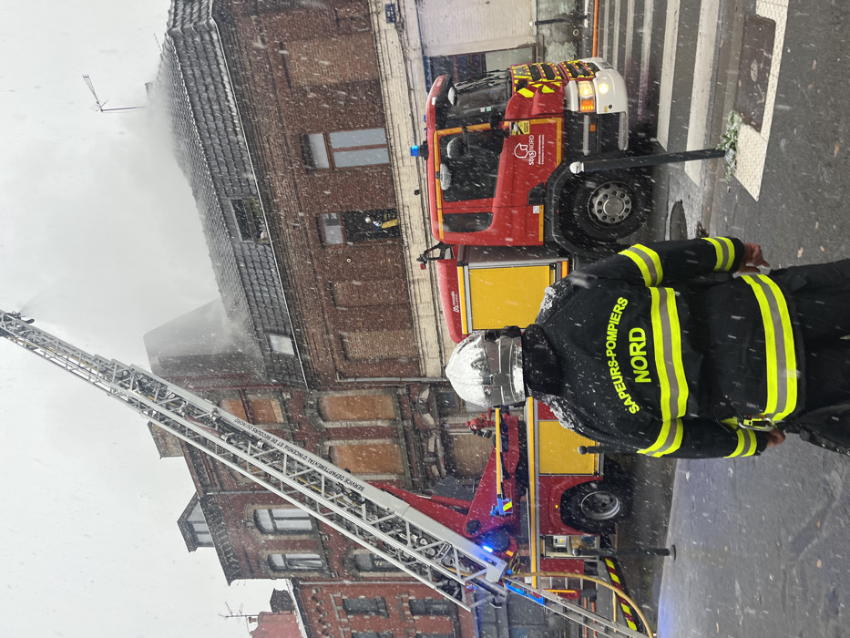The image depicts an active firefighting operation on a snowy day in Roubaix, France