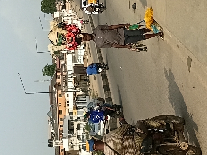 On a sunny day, a man stands on a city street, his shadow cast behind him. He carries a collection of colorful items on his head and in his hand, possibly for sale. Cars and motorcycles move along the road. Buildings line the street, with a mix of residential and commercial structures. Street lights stand tall along the road.