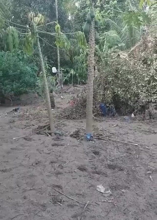 The scene is a muddy area with scattered debris, including branches and trash. Two papaya trees with green fruit stand upright. A thick, leafy shrubbery is visible in the background, along with taller trees. A person wearing a white hat walks in the distance between the papaya trees and the shrubbery. A long pipe or pole lies on the ground to the right.