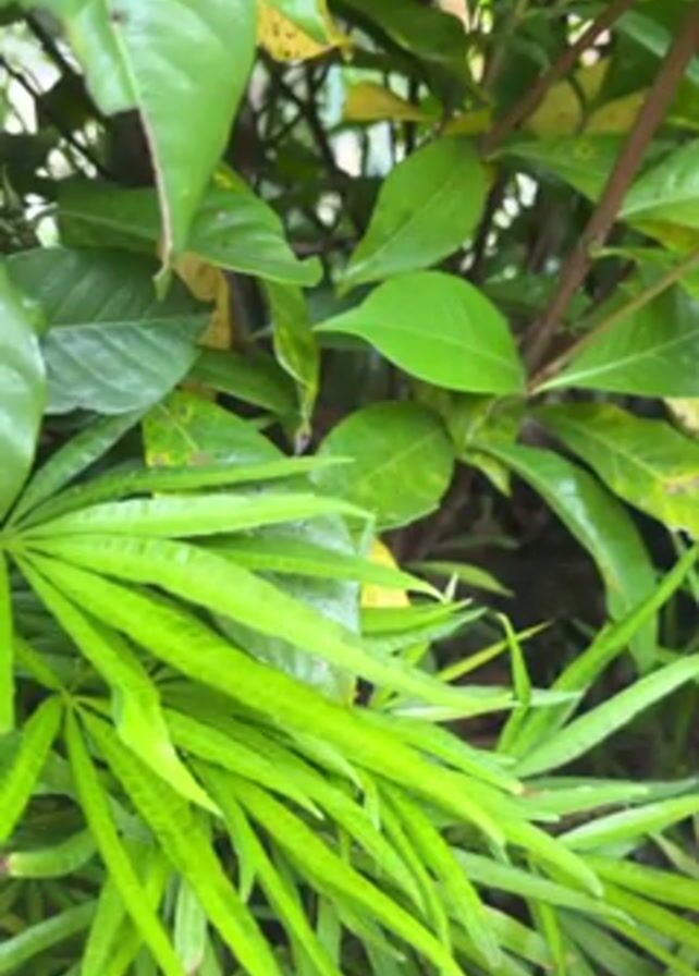 close-up of lush green foliage. Several types of leaves are visible, including long, slender blades and broader, more rounded leaves. Some leaves are slightly wet. The light is dappled, suggesting an outdoor environment with some shade. There are no people, animals, or evident interactions within the frame. The scene appears to be a detail of a garden or natural area.