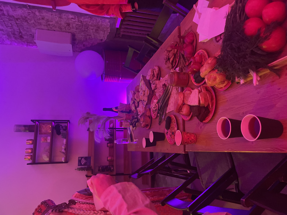 An indoor scene in Укромновское сельское поселение, Ukraine, illuminated by a dominant purple-pink ambient light, features a long wooden table set for a meal. On the far left, a person is partially visible, wearing a traditional red and gold headdress, a braided blonde wig, and a light-colored, embroidered garment; their right hand is raised, holding a small, light object. The wooden table is extensively covered with various food items and beverages. Multiple red plates contain an assortment of sliced bread (white and dark), pickles, pastries/buns, and other prepared dishes. Fresh green onions, dill, and red tomatoes are displayed on the table surface. A glass jar of preserves and a bottle (possibly wine) are also present. Black and red paper cups, some containing a dark liquid, are distributed along the table. The room's left wall is smooth and light-colored, featuring a three-tiered shelf unit with decorative objects and a lower shelf displaying bottles and a Wi-Fi symbol sticker. The right wall is exposed brick, mounting a white rectangular speaker and featuring a white spherical light fixture resting on a red industrial barrel. Dark-colored folding chairs with cushions are positioned around the table, indicating seating for a gathering.