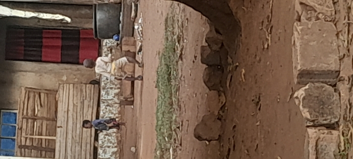 Two children stand outside a small, impoverished house. One child wears a light-colored shirt and is partially obscured. The other child, closer to the viewer, wears a blue shirt. The house has simple wooden doors and a window with blue frames. A black and red checkered curtain hangs in another window. A stone structure borders the right side of the image, and some sparse greenery is visible along the ground. The scene suggests a rural or underdeveloped setting.