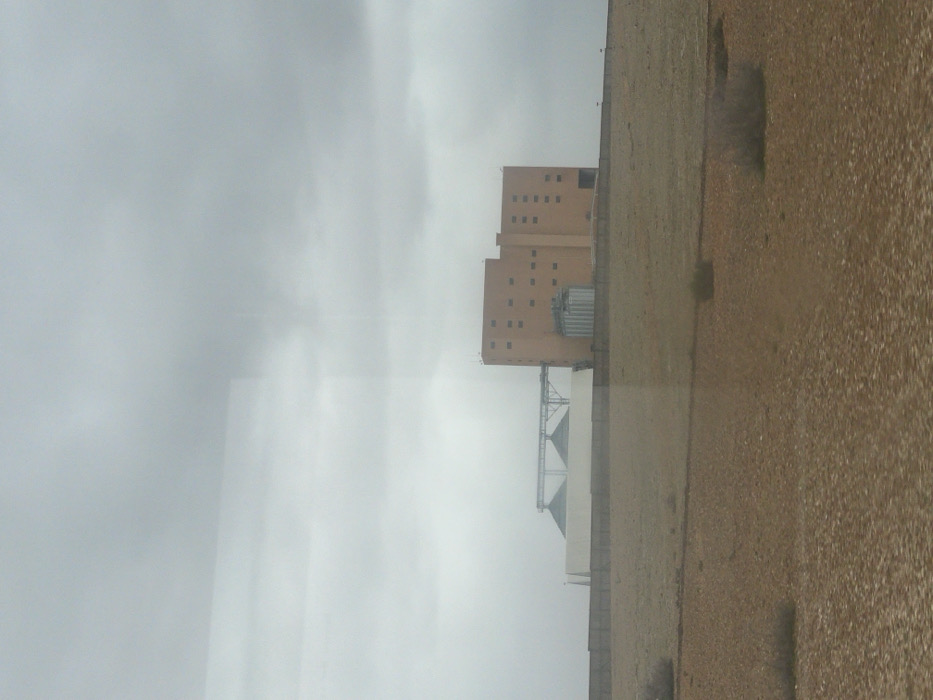 A beige building complex stands against a cloudy sky, featuring a tall, multi-story structure with several windows. Silos and industrial apparatuses are connected to it. A light brown, textured ground stretches to the right, marked by sparse vegetation. The overall scene evokes a sense of industrial or agricultural facility under an overcast sky. The photograph has been rotated.