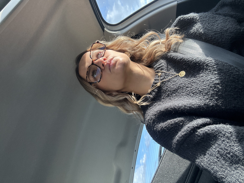 The scene depicts a female individual seated in the front passenger or driver's side of a vehicle, in what is stated as Chantemerle-les-Blés, France. No specific external landmarks of the city are visible within the frame. The individual, appearing to be a young adult, has wavy light brown hair. She wears large, tortoise-shell patterned, rectangular-framed glasses with a blue tint visible in the lenses. Her attire consists of a dark grey, knitted crew-neck sweater. She is accessorized with a gold-colored earring in her visible right ear and two gold-colored necklaces; one features a small circular pendant, and the other is a shorter, possibly beaded chain. A dark-colored seatbelt is fastened diagonally across her chest and left shoulder. The individual is looking upwards and to her right, exhibiting a neutral facial expression. Strong natural sunlight enters the vehicle from the right side, illuminating the right side of her face and hair, and creating prominent shadows. The vehicle's grey headliner is visible overhead. Through a portion of the vehicle's rear window on the left, a clear blue sky with some scattered white clouds is discernible.