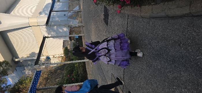 The scene depicts an outdoor paved pathway within Ocean Park, Hong Kong, China, under bright daylight. A young female child, viewed from behind, walks forward, dressed in a multi-tiered purple and black gown featuring various bows, black leggings, and white athletic shoes. Her dark hair is styled in a high ponytail. To her immediate left, an adult, partially visible from the torso down, walks in the same direction, wearing a light pink short-sleeved top, dark trousers, and black shoes, carrying a bright blue tote bag over their left shoulder. The pathway is dark grey and textured. On the left, a steep, green hillside rises, partially obscured by a blue-and-white polka-dotted canopy structure supported by white poles. The background is dominated by a large, light-toned building characterized by vertical ribbed paneling, prominent angular structural columns, and a visible white drainage pipe descending along its facade. Additional white metal poles and horizontal bars line the pathway, which is bordered by green foliage and sporadic clusters of pink flowering plants. Potted red flowers are also visible in the mid-ground along the path.