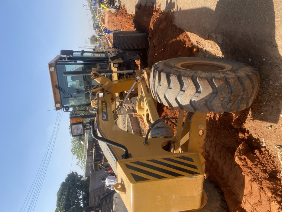 - "A bright yellow SANY STG100-6S motor grader, covered in reddish-brown dust, is positioned on an unpaved road in Gobirawa, Nigeria, actively engaged in road construction" by FM-98raS2, licensed under CC BY 4.0