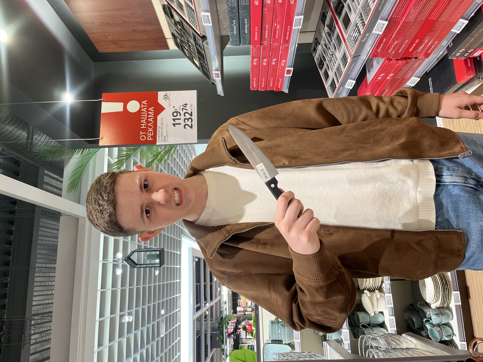 young male holding a knife in a store, likely in Stara Zagora, Bulgaria, given the Bulgarian text on the promotional sign above his head