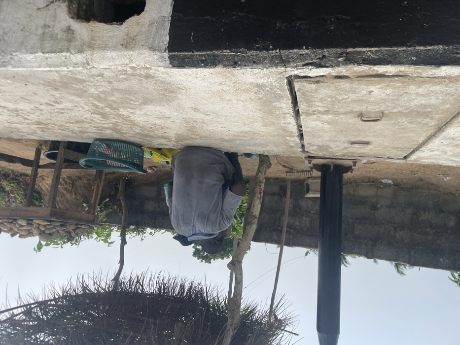 The image depicts an outdoor scene in Itoga, Nigeria, captured from a slightly elevated perspective. In the immediate foreground on the right, a large, light-colored concrete structure is visible, featuring a rectangular access panel with two metallic handles. A section of this structure's lower edge is painted dark. A black, cylindrical metal pump handle or pipe extends vertically from the concrete structure on the left side, secured by bolts. A single individual, appearing male, is positioned in the mid-ground, squatting or bent over, facing away from the camera and towards the background. He wears a grey short-sleeved top and dark trousers. A dark cap or head covering is visible on his head. His right forearm appears to be covered by a light blue material, possibly a glove or a protective sleeve. Near the individual, a green plastic laundry basket rests on the dirt ground, with a yellow fabric object partially visible beneath it. Further in the background, a dark-colored bucket is placed on a raised wooden platform. The ground behind the individual transitions to a low concrete block wall, beyond which is lush green vegetation. In the distant background, a wooden scaffold-like structure supports what appears to be a pile of yams or similar produce. To the far left, sparse trees with bare branches and elements of a thatched roof are visible against an overcast sky, suggesting diffused natural light.