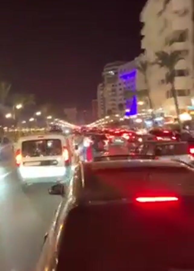 nighttime traffic congestion on a city street. Cars are backed up and moving slowly, with bright red taillights visible. There are people walking along the side of the road, and some are crossing the street. Tall buildings line the street, some with blue lighting. Palm trees are also visible. The video is shot from inside a car. Someone honks the car horn at one point.