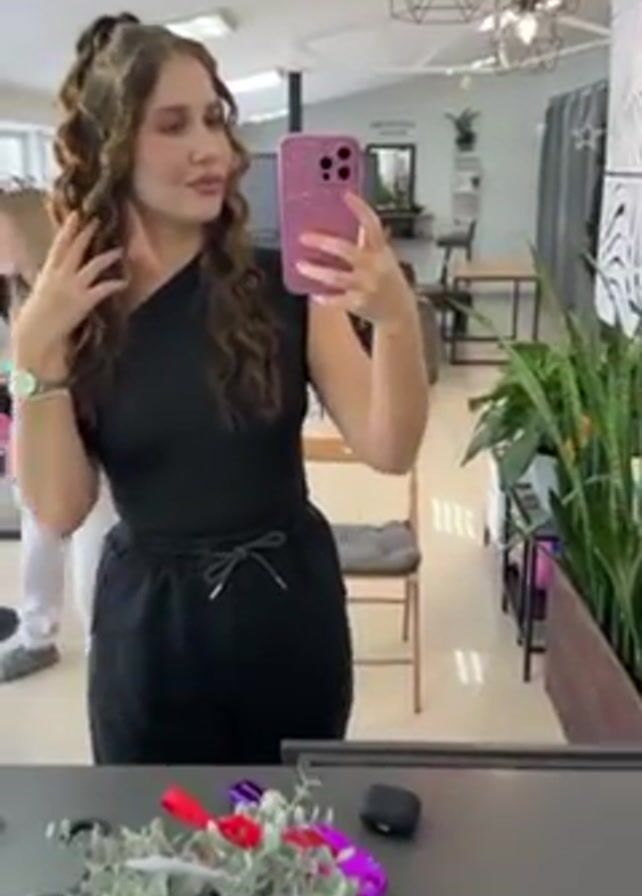 A young woman is taking a selfie in a beauty salon. She is wearing a black one-shoulder top and black sweatpants. Her hair is styled in loose waves and partially pulled back. She is holding a pink glittery iPhone in her right hand. The background shows salon chairs, tables, mirrors, plants, and other people. The lighting is bright and airy.