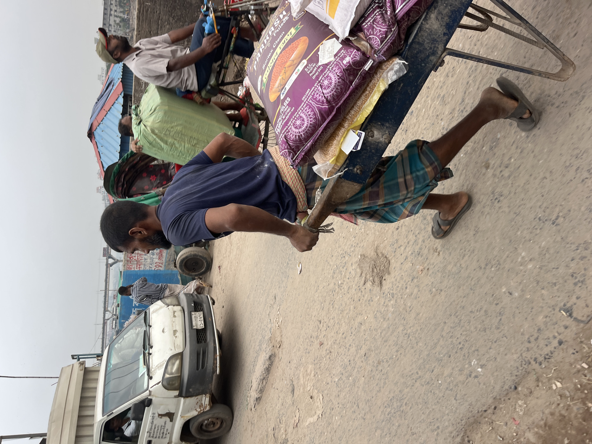 A man is pulling a cart laden with bags, including one labeled "PARKASH Pulses," down a paved road in Keraniganj, Bangladesh. He wears a blue shirt and plaid lungi, with sandals on his feet. A white van with a license plate reading 'ঢাকা-গ-৫৮-৫৬৭০' is parked nearby. In the background, another man is seated on a three-wheeled vehicle, with a green tarp draped over it. The setting appears to be an outdoor urban area.