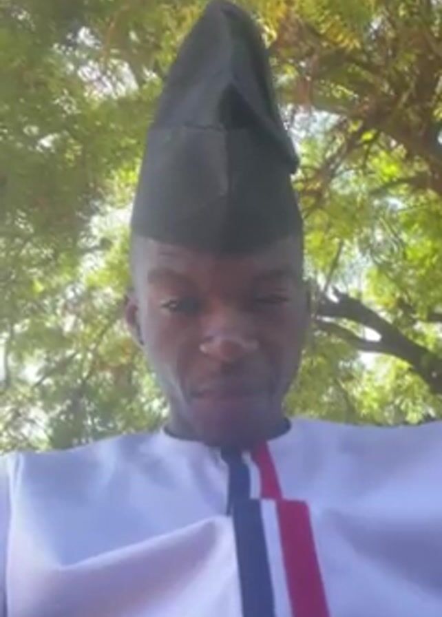 The video features a man wearing a tall, black, conical hat and a white shirt with red and blue stripes on the front. He is outdoors, likely under a tree with green foliage visible in the background. The camera is close to his face, capturing his expressions, which alternate between smiling and pulling funny faces. There are other people in the background, but the focus remains on the man's face and attire.