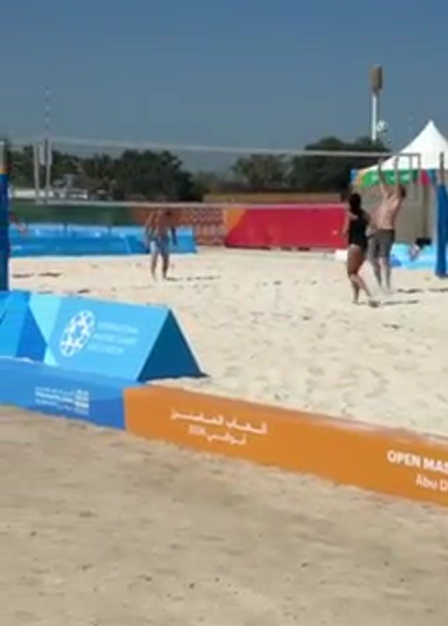 The video depicts a beach volleyball game in progress. Four individuals, three men and one woman, are actively playing on a sandy court. The woman, wearing a black swimsuit, is positioned towards the center of the frame and has just served the ball. One of the male players is kneeling on the sand, presumably attempting to make a play on the ball. Two other players are standing ready, positioned at different points on the court. A volleyball net is strung across the center of the court. The scene takes place on a sunny day, with a clear blue sky overhead. Behind the court, there are trees and two white tents. The perimeter of the court is marked with blue and orange signs that say "International Masters Games Association" and "Open Masters Games Abu Dhabi 2026" in both English and Arabic.