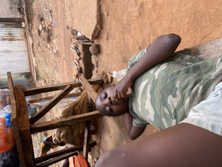 A child in a camouflage shirt is lying on a wooden bench or platform, hand near their mouth. Next to the child is a wooden structure with a broom leaning against it. There are containers and objects on the wooden structure. The ground is dirt and there is what appears to be a building or stall in the background.