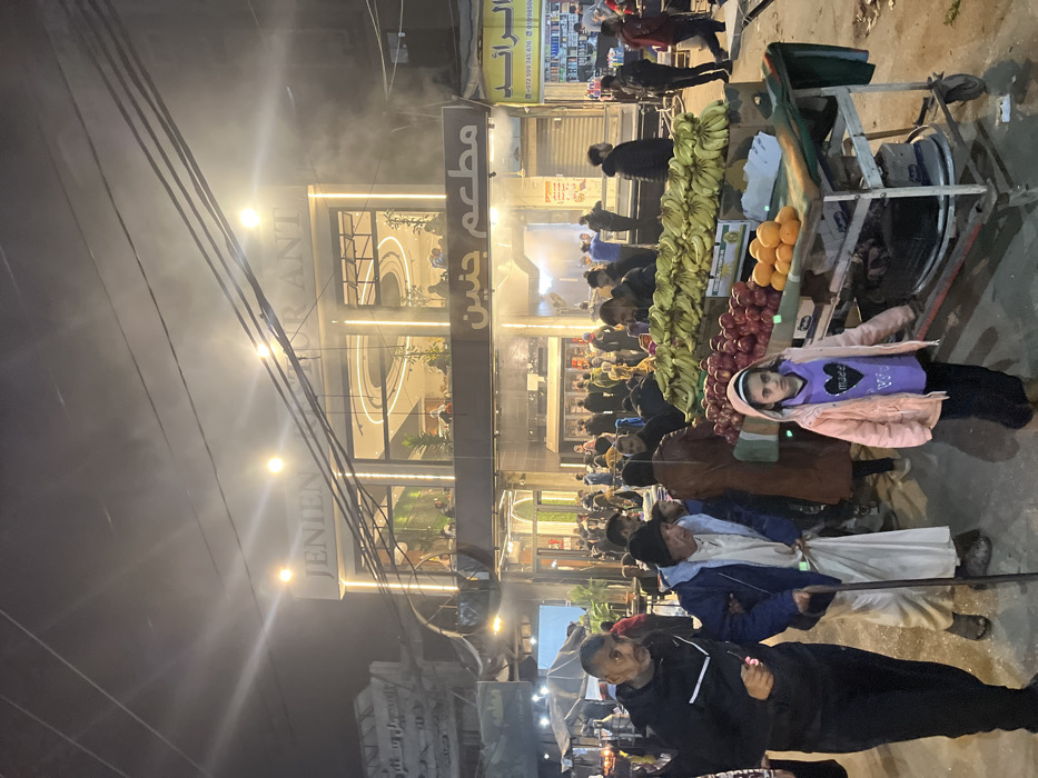 A nighttime street scene with a modern building labeled "Jenien Restaurant" in English and Arabic. A crowd of people fills the sidewalk. A fruit cart laden with bananas, apples, and oranges stands prominently in the foreground. A young girl in a pink coat looks toward the camera. Overhead, power lines crisscross the sky. A sign with Arabic script is visible above a shop.